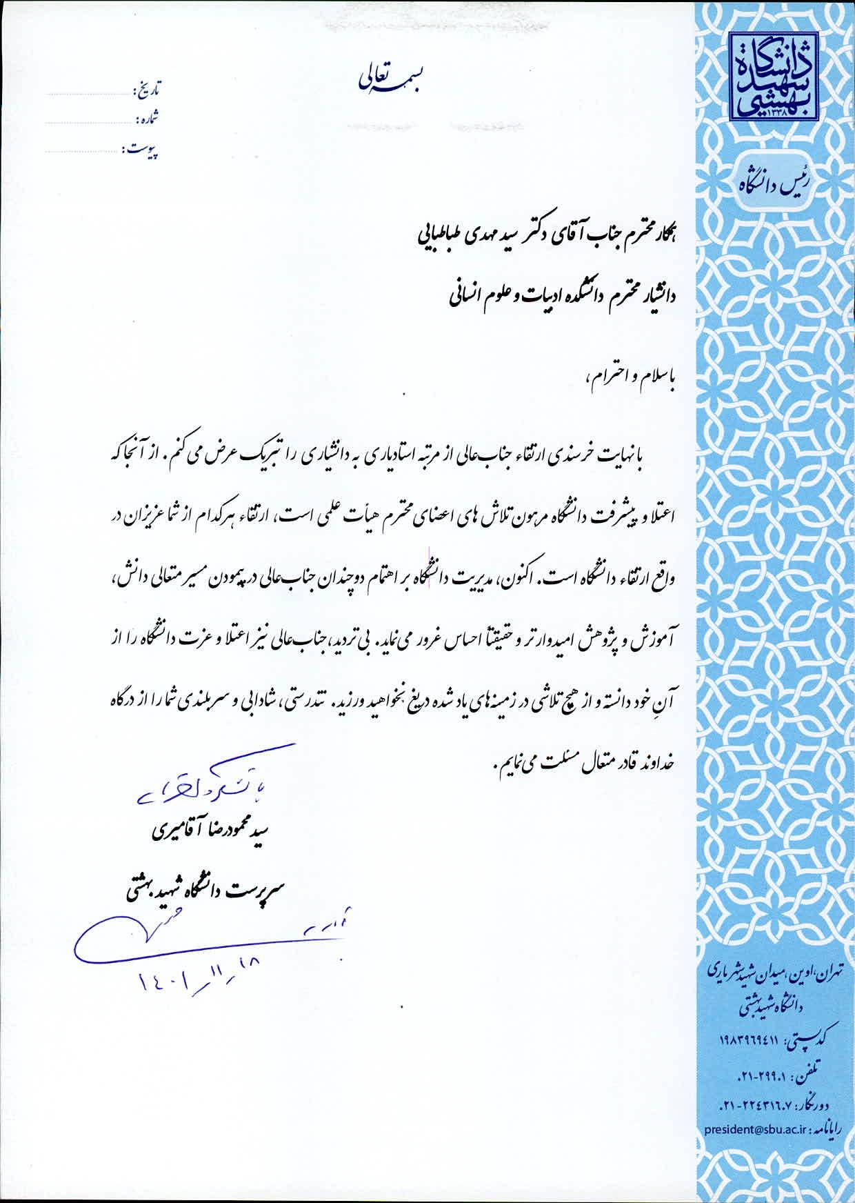 دکتر سید محمود آقامیری، رئیس دانشگاه شهید بهشتی، با ارسال پیامی ارتقاء مرتبه علمی دکتر سید مهدی طباطبائی ، عضو هیات علمی دانشکده ادبیات و علوم انسانی را از مرتبه استادیاری به دانشیاری تبریک گفت. متن پیام به شرح زیر است: