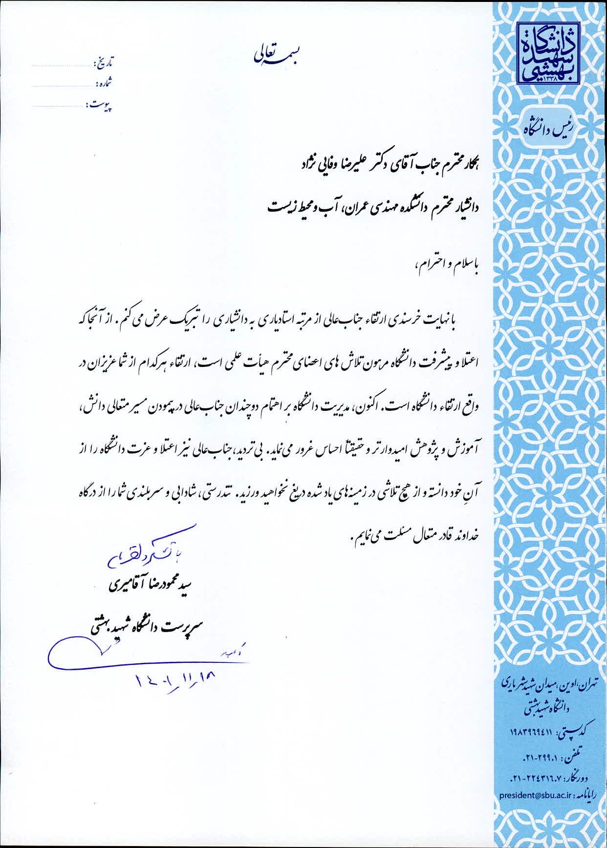 دکتر سید محمود آقامیری، رئیس دانشگاه شهید بهشتی، با ارسال پیامی ارتقاء مرتبه علمی دکتر علیرضا وفائی نژاد ، عضو هیات علمی دانشکده عمران، آب و محیط زیست را از مرتبه استادیاری به دانشیاری تبریک گفت. متن پیام به شرح زیر است: